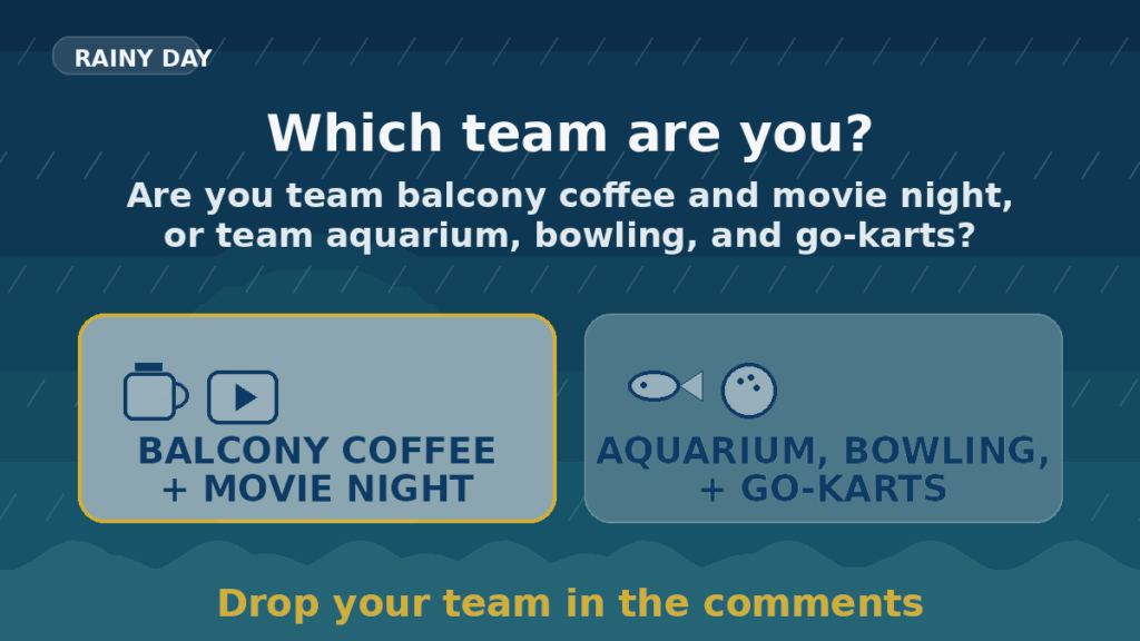 🫵Your turn: Are you team balcony coffee and movie night, or team aquarium, bowling, and go-karts?